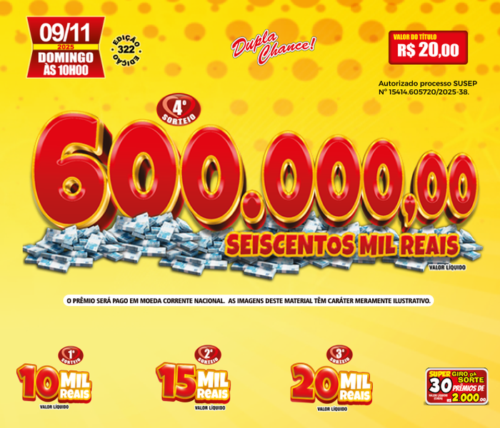 Sorteios realizado aos Domingos, às 09h00, ao vivo através TV Record e You Tube.